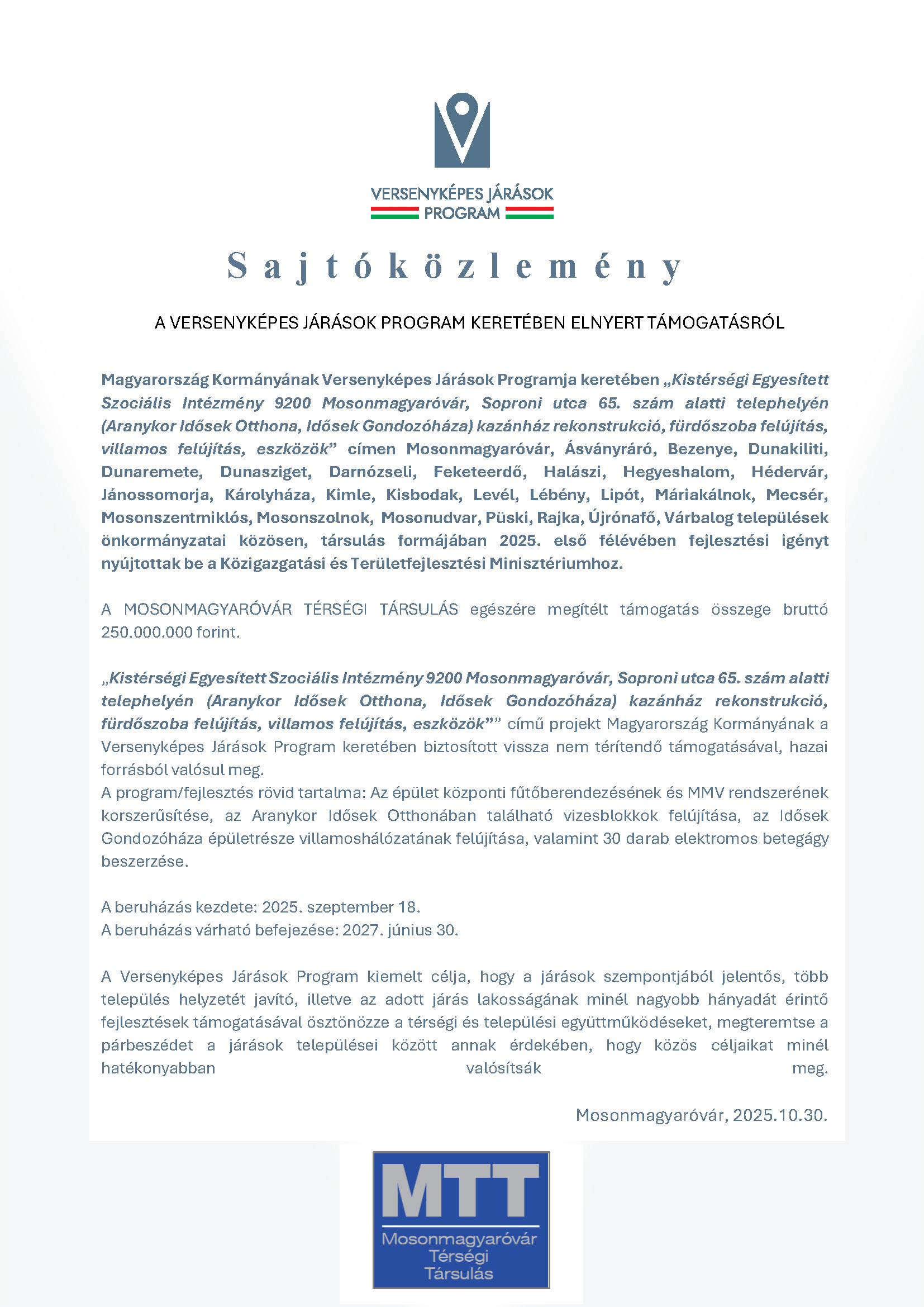A Kistérségi Egyesített Szociális Intézmény 2010. január 01-étől működik Mosonmagyaróvár Térségi Társulás fenntartásában, azt megelőzően Mosonmagyaróvár Város Önkormányzata volt a fenntartó. Az intézmény közel 60 éves múltra tekint vissza, mára a térség valamennyi településén elérhetőek a szolgáltatások.